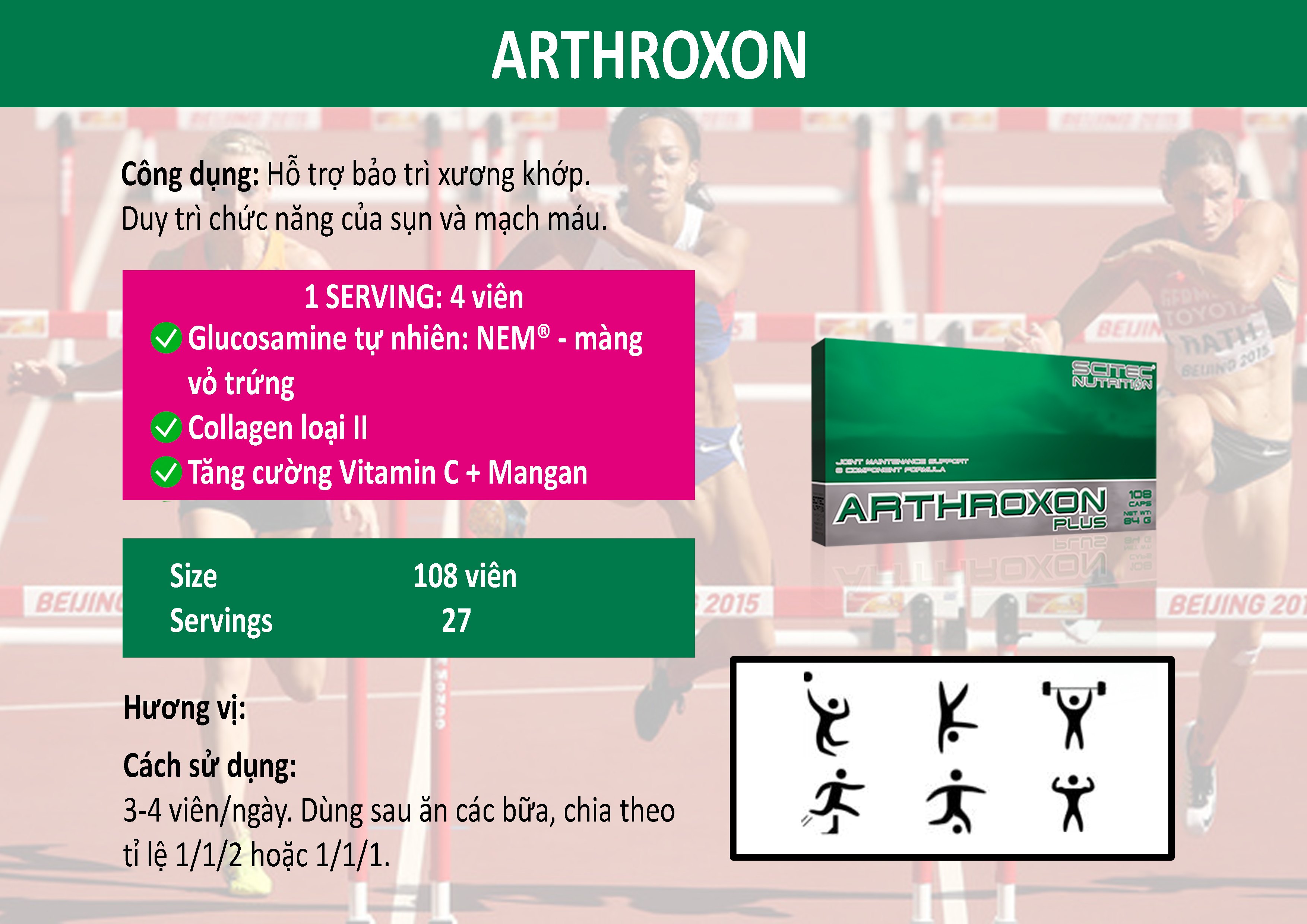 Arthroxon giải quyết các vấn đề đau nhức xương khớp, khô khớp khi tập nặng hoặc bị lão hóa. Sản phẩm này còn được bổ sung thêm Vitamin C và mangan giúp hình thành các mô liên kết, tiết dịch khớp, Vitamin C góp phần hình thành collagen nhằm duy trì chức năng của sụn, mạch máu, nướu, răng và da.